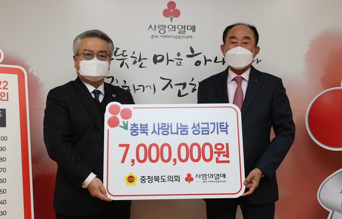 [충북=세계타임즈 이현진 기자] 충청북도의회는 30일 충북사회복지공동모금회(회장 노영수)를 방문해 어려운 이웃과 소외계층을 위해 써달라며 700만원을 기탁했다.
