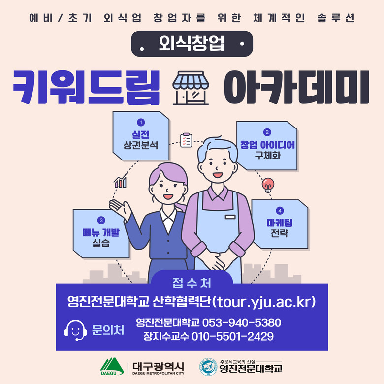 노권율 대구광역시 위생정책과장은 “지금처럼 외식 시장이 어려운 시기일수록 체계적인 준비가 성공을 좌우한다”며, “키워드림 아카데미 과정을 통해 창업 실패를 줄이고 지속 가능한 경영 기반을 다지는 데 실질적인 도움이 되길 바란다”고 말했다.