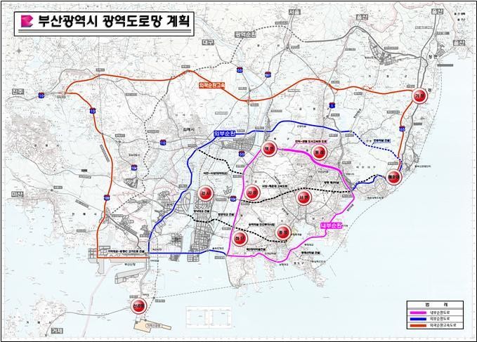 * 외부순환도로망(반송터널 외 완료) : 66호광장(신평동)~녹산산단~신항배후도로~대동화명대교~산성터널~반송터널~동부산나들목(IC)~벡스코나들목(IC)