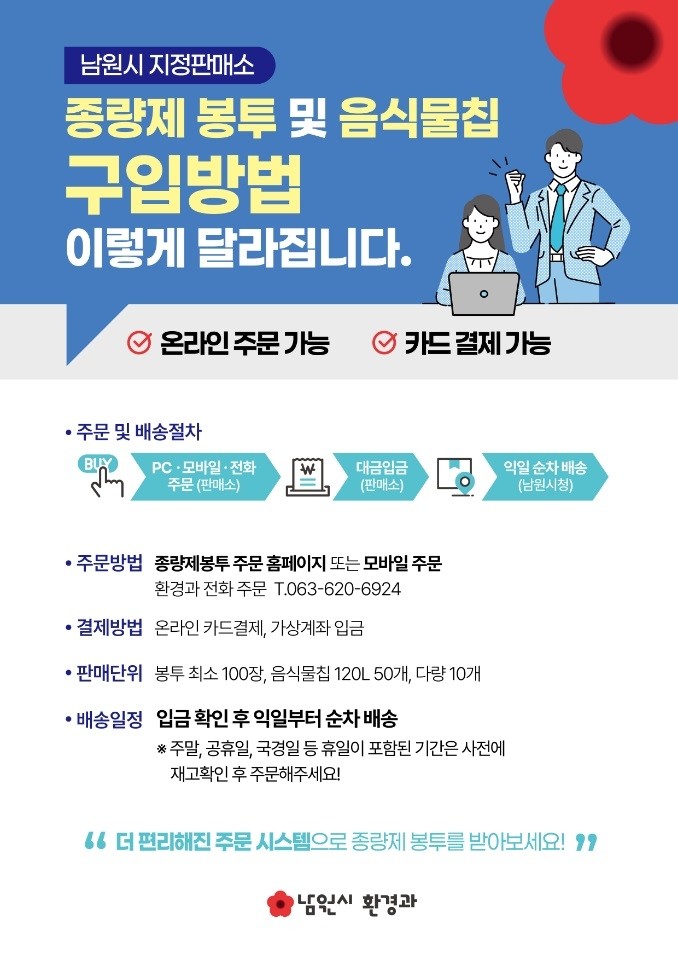 최경식 남원시장은 “종량제봉투 구매 과정에서 불편이 발생하지 않도록 공급 체계 관리에 최선을 다하겠다”며 “이번 시스템이 판매소의 편리한 주문·결제를 지원하고, 더 나아가 효율적인 유통 구조 정착과 투명한 예산 관리로 이어지길 기대한다”고 말했다.