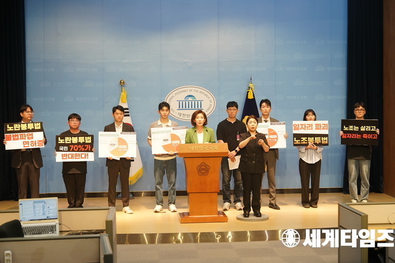 '나경원' 국민의힘 의원이 12일 국회 소통관에서 노동개혁청년행동의 노란봉투법 입법 반대 기자회견에 앞서 발언하고 있다.
