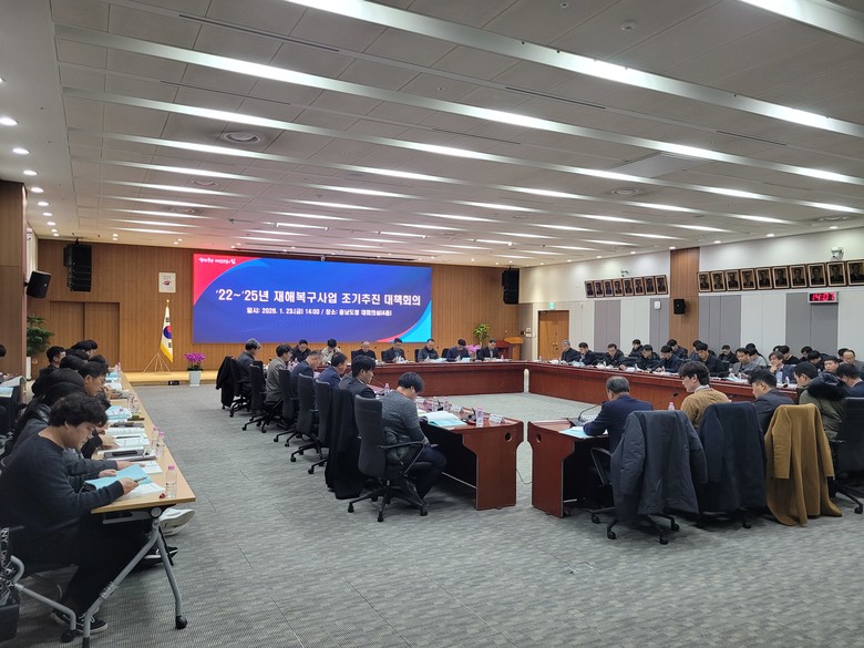 도는 23일 도청 대회의실에서 신일호 안전기획관 주재로, 도 관련 부서 및 시군 과장들이 참석한 가운데 ‘재해복구사업 조기 추진 대책회의’를 개최했다.