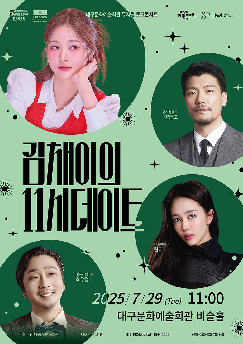 ‘김채이의 11시 데이트’는 뮤지컬(Musical)과 이야기(Talk)가 만나는 특별한 형식의 콘서트로, 무대 위의 뮤지컬 넘버와 무대 뒤 이야기들을 배우들이 직접 나누며, 뮤지컬을 더욱 입체적으로 즐길 수 있도록 기획된 공연이다.