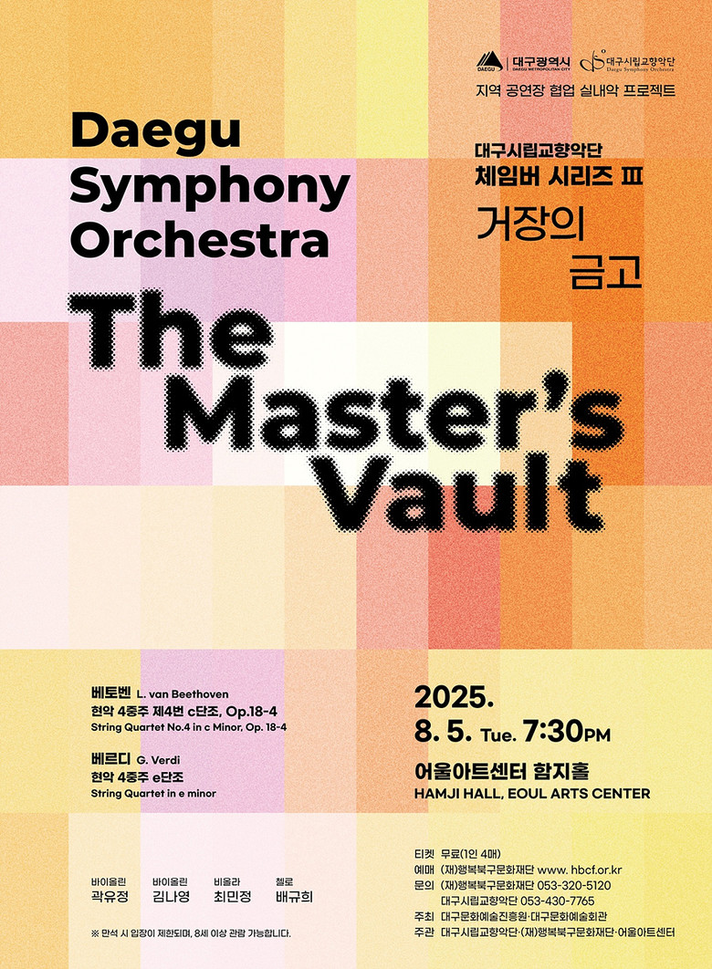 대구시립교향악단 ‘체임버 시리즈 Ⅲ : 거장의 금고’는 (재)행복북구문화재단 누리집(www.hbcf.or.kr)에서 1인당 4매까지 무료 예약할 수 있다. 만석 시 입장이 제한되며, 초등학생 이상 관람 가능하다.