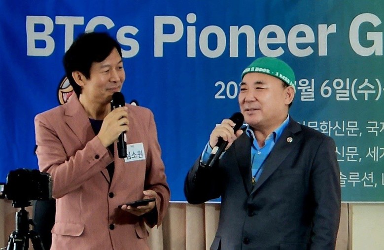 ■사진=좌측)심소원 아나운서가 김재덕 BTCS 장학재단 이사장에게 "비트코인 사토시" 핵심 블룩체인 기술에 대해서 질문을 하고 있는 장면