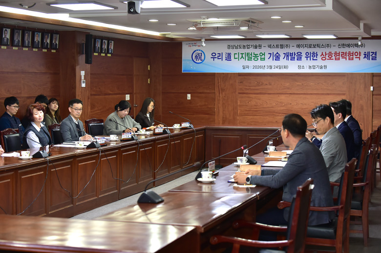 - 공공 연구 인프라와 민간 솔루션 융합... 로봇·인공지능 기반 고유 모델 구축 [세계타임즈=경남 최성룡 기자] 경상남도농업기술원(원장 정찬식)은 24일 농업기술원 회의실에서 신한에이텍(주), 에이지로보틱스(주), 넥스트웹(주)과 ‘경상남도 디지털 농업 기술 공동 개발 및 상호 협력을 위한 업무협약(MOU)’을 체결하고 기술 혁신 거버넌스 구축에 나섰다.