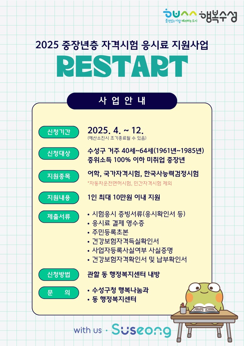 대상자는 신청일 기준으로 수성구에 1년 이상 거주한 40세~64세(1961년생~1985년생)의 중위소득 100% 이하 저소득 중장년 미취업자로, 올해 1월 1일 이후 시험에 응시한 경우라면 합격 여부와 관계없이 신청할 수 있다.