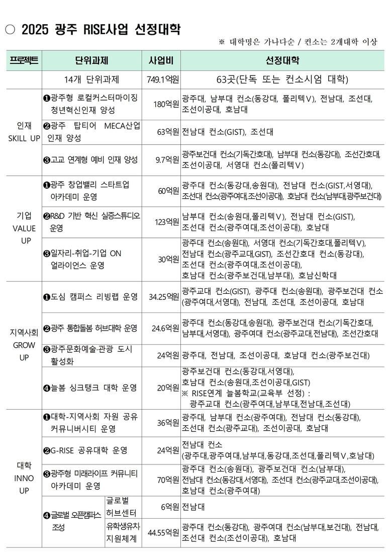 광주시는 이 중 인재 스킬업, 기업 밸류업, 지역사회 그로우업, 대학 이노업 프로젝트를 공모했으며, 지난 3일 광주라이즈위원회를 열어 14개 단위과제, 17개 대학(과제별로는 63개 대학)을 선정했다. 또 총 사업비 749억1000만원의 과제별 평가등급 배분방식을 결정했다.