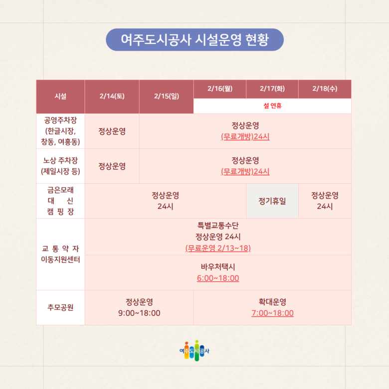 설 연휴 시설 운영과 관련한 자세한 사항은 여주도시공사 홈페이지(www.yeojuuc.or.kr)를 통해 확인할 수 있다.