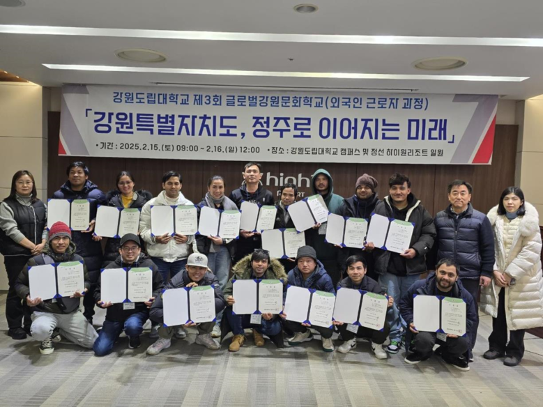 [강원도 세계타임즈=김민석 기자] 강원도립대학교(총장 김광래) 국제교류원 글로벌강원문화학교는 2월 15일부터 16일까지 양일간 태백 하이원리조트에서 “외국인 근로자 겨울 문화캠프 과정”을 성공적으로 마쳤다고 밝혔다.