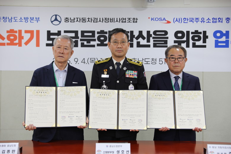 특히 충남소방본부는 차량용 소화기 보급 문화 확산을 위한 정책적 지원과 차량 화재 예방 홍보를 주도하고, 한국주유소협회 충남도회와 충남자동차검사정비사업조합은 소속 업체를 통해 차량용 소화기 판매와 비치 안내를 적극 추진하기로 했다.