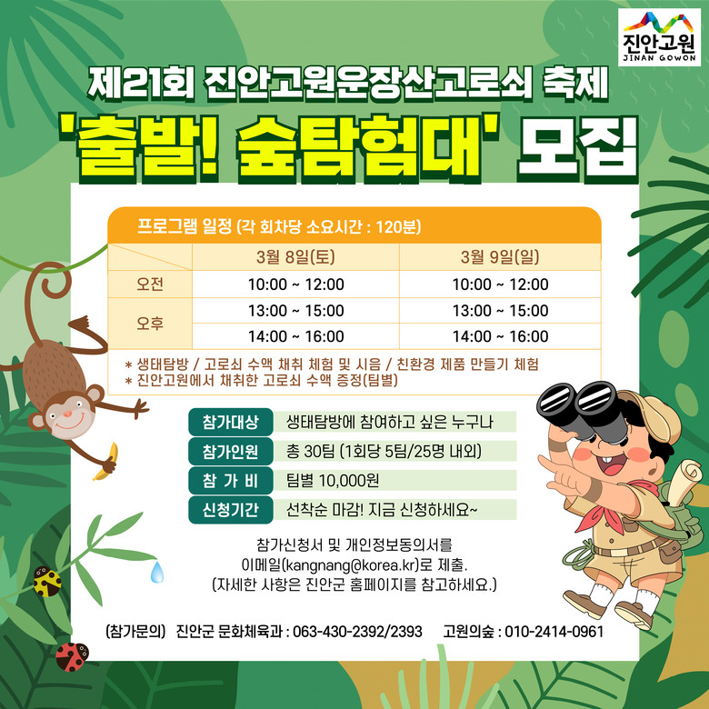 프로그램 참가자 모집은 2월 28일까지 선착순으로 진행되며, 진안군 홈페이지(https://www.jinan.go.kr/) 공지사항에 게시되어 있는 신청서를 절차에 따라 제출하면 된다.