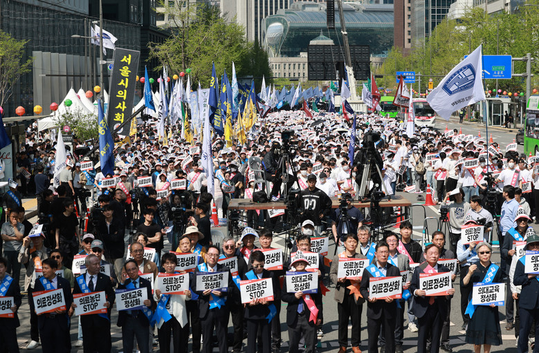 20일 서울 중구 숭례문 인근 세종대로에서 대한의사협회 주최로 열린 '의료정상화를 위한 전국의사궐기대회' 참가자들이 정부의 의대 증원 정책과 의료개혁특별위원회 운영 등을 규탄하고 있다. 2025.4.20