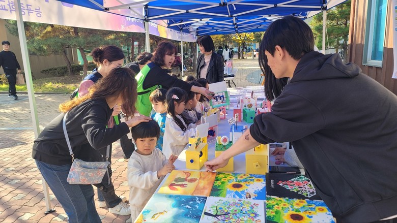 ‘능곡 유니버스 전시 부스’는 학교비전(미래를 여는 교육, 꿈을 키우는 학교)과 학년 가치(같이의 가치) 알리기 활동과 교과 및 자유학기 시간에 활동한 작품을 전시하는 부스로 1학년 도우미 학생들과 본교 교사가 전시작품에 대해 직접 설명하여 마을 주민과 어린이들이 전시작품을 감상하고 체험할 수 있도록 도움을 주었다.