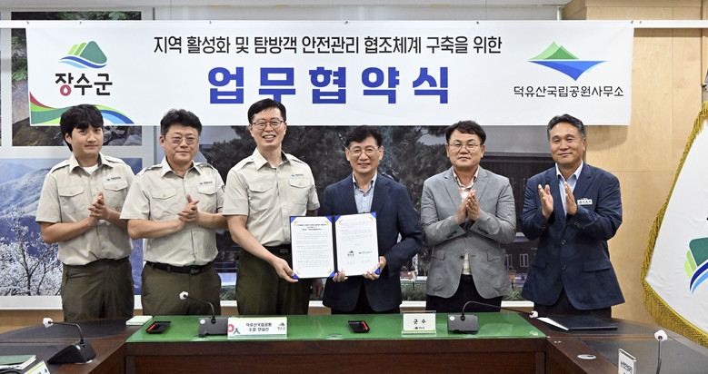 탐방로 안전관리 및 재난·재해 대응, 이용 활성화 협조체계 구축 [세계타임즈=장수군 김서주 기자] 장수군은 지난 20일 국립공원공단 덕유산국립공원과 ‘지역 산악 관광 활성화 및 탐방객 안전관리 협조체계 구축을 위한 업무협약(MOU)’을 체결했다고 밝혔다.