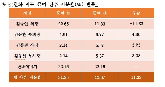 (주) 한화 지분 증여 후 전후 지분율 변동[한화그룹 제공]