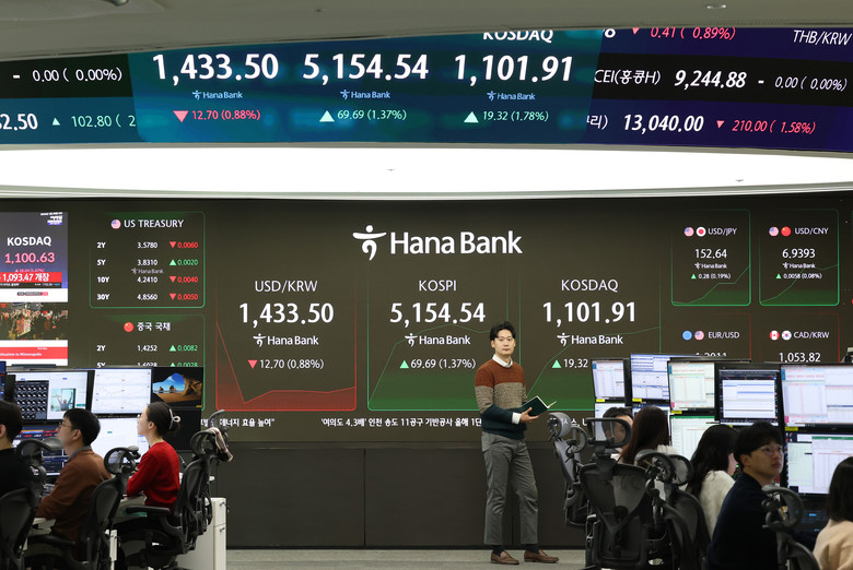 28일 서울 중구 하나은행 딜링룸 현황판에 코스피지수와 코스닥지수가 표시되고 있다. 코스피지수는 전장보다 60.54포인트(1.19%) 오른 5,145.39에, 코스닥지수는 10.88포인트(1.00%) 오른 1,093.47에 개장했다. 2026.1.28