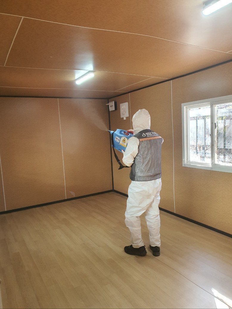| ▲ 임시 컨테이너 보호소를 청소 및 방역하는 모습 |