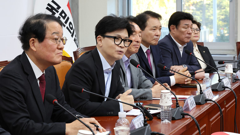 국민의힘 한동훈 대표(왼쪽 두번째)가 6일 오전 국회에서 열린 국방·외교 현안관련 긴급 점검회의를 마친 뒤 마무리 발언을 하고 있다. 2024.11.6