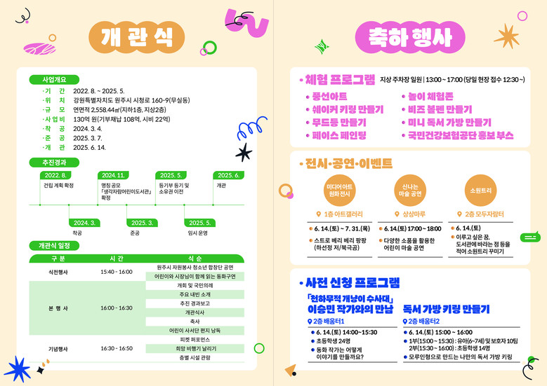 한편, 14일(토) 오후 4시 개관식을 시작으로, 식전 행사로 △원주시 자원봉사 청소년 합창단 공연 △어린이와 시장님이 함께 읽는 동화구연을 진행하며, 본 행사에도 어린이들이 함께하는 △어린이 사서단 편지 낭독 △피켓 퍼포먼스와 희망 비행기 날리기를 진행한다.