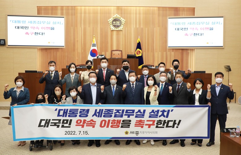 세종시의회 의원 전원은 공동 발의한 결의안에서 윤석열 대통령의 공약이자 대통령직인수위원회를 통해 발표했던 로드맵에 따라 대통령 집무실 설치를 원안대로 추진할 것을 촉구했다.