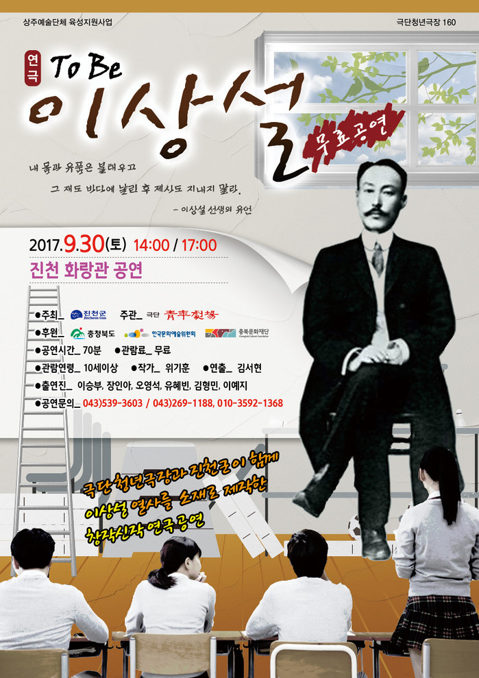 진천군 화랑관 상주예술단체인 ‘극단청년극장’이 창작한 ‘To Be 이상설’연극 공연이 축제 이틑날인 30일 진천 화랑관에서 펼쳐진다.