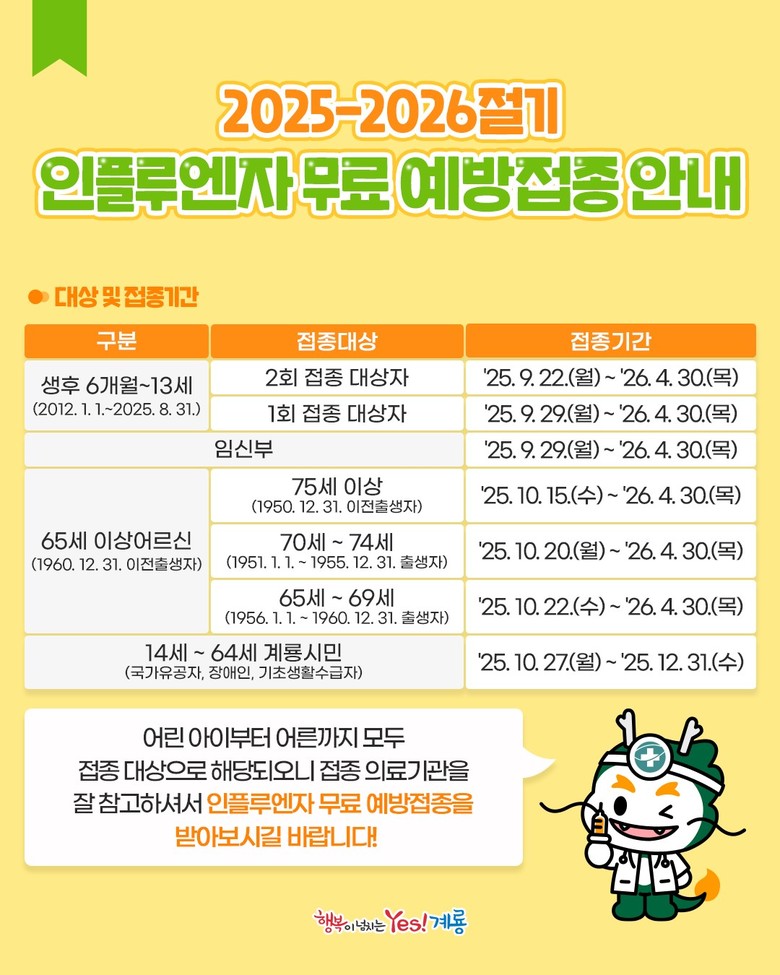 시 보건소 관계자는 “인플루엔자(독감) 예방접종은 감염병으로 인한 질병과 합병증을 줄이는 가장 확실한 방법”이라며, “올겨울 유행에 대비해 예방접종에 적극 참여해 주시길 바란다”고 말했다.