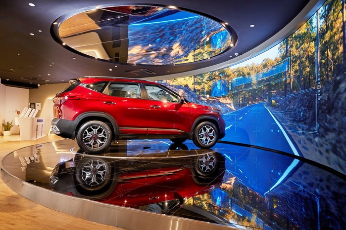 ‘BEAT360 델리’는 ▲나만의 차량 옵션 구상 및 3D 가상 주행 체험이 가능한 3D 컨피규레이터존 ▲혼합현실(MR, Mixed Reality) 신기술로 차량 상세 USP를 소개하는 MR 체험존 ▲초고해상도 대형 LED 스크린 (11mX2.4m)과 턴테이블에서 기아차 미래 비전 영상을 상영하는 서라운드 미디어존 등으로 구성돼 기아차를 처음 접하는 인도 고객들을 위해 기본적인 브랜드 소개부터 첨단 디지털 기기를 통해 직접 셀토스의 구석 구석을 색다르게 체험할 수 있는 기회를 제공한다.