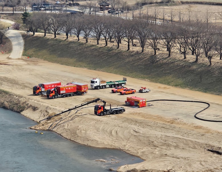 [세계타임즈 = 이영진 기자] 3월 28일 하회마을과 인접한 안동댐 하류 경북 안동시 풍천면 인근 낙동강 본류에서 산불 진압을 위한 소방 용수가 취수되고 있다.