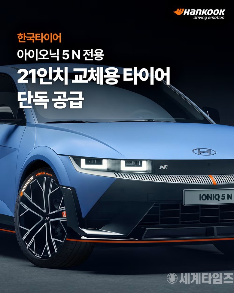 [세계타임즈=방춘재 기자] 한국앤컴퍼니그룹의 글로벌 선도 타이어 기업 한국타이어앤테크놀로지㈜(대표이사 안종선·이상훈, 이하 한국타이어)가 현대자동차 ‘N 퍼포먼스 파츠(N Performance Parts)’ 공식 온·오프라인 채널 ‘N 퍼포먼스샵(N Performance Shop)’, ‘N 퍼포먼스 개러지(N Performance Garage)’, ‘N 블루핸즈(N Bluehands)’ 등에 고성능 전기차 ‘아이오닉 5 N(IONIQ 5 N)’ 전용 초고성능 슈퍼 스포츠 타이어 ‘벤투스 S1 에보 Z(Ventus S1 evo Z)’ 21인치 제품을 교체용 타이어로 독점 공급한다.