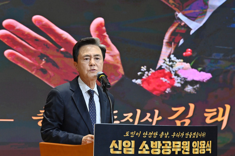 김태흠 지사, 성호선 소방본부장, 신임 소방공무원과 가족 등 250여 명이 참석한 가운데, 이번 행사는 소방 훈련 영상 상영, 임명장·계급장 수여, 공무원 선서 등의 순으로 진행했다.