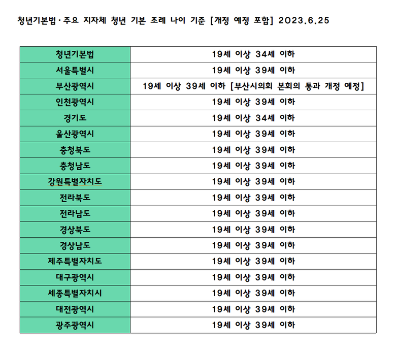 청년기본법과 경기도를 제외한 모든 지자체 지역들이 아래 사진을 보게 되면 39세로 개정된 상황에서 부산광역시는 과거 34세 이하였으나, 지난 6월 21일 본 회의에 원안 가결되어 39세 상향에 대한 공포만을 앞두게 된 상황에서 전국 지자체 중에서는 경기도를 제외한 모든 지자체들 평균 청년 나이가 39세로 상향된 유의미한 결과를 가지게 되었다. 이는 곧, 전국 지자체들이 기존 청년기본법의 나이로는 한계와 문제점이 많아 지자체가 조례를 근간으로 전국적으로 개정한 의미는 청년기본법 나이에 대한 개선과 혁신이 필요한 상황이라는 의미를 가진다고 말할 수 있으며, 경기도 지역 역시 청년 나이 기본 조례에 대한 고민과 목소리가 필요하다고 할 수 있다.