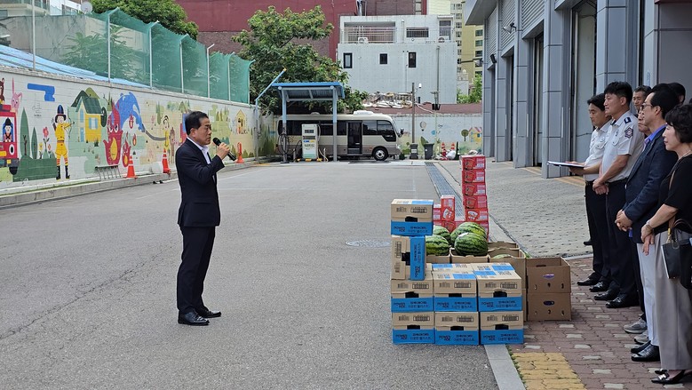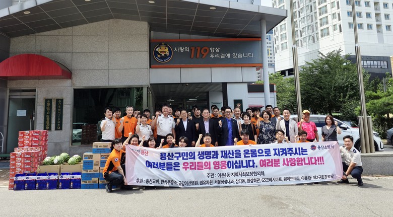 이번 방문은 용산구 관내 이촌1동 지역사회보장협의체 주관으로 마련되었으며, 지역 내 다양한 기관과 단체가 함께 뜻을 모아 후원에 참여했다. 충신교회, 한국석유㈜, 서울삼성내과, 쉐이드트리, 금강아산병원, 원 유치원, 제주 삼다돈, 한강회관, GS프레시마트, 구립경로당 등에서 시원한 수박과 이온음료, 자양강장제, 믹스커피, 컵라면 등 위문물품을 소방관들에게 전달했다.