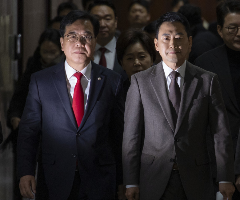 국민의힘 장동혁 대표(오른쪽)와 송언석 원내대표가 29일 국회에서 열린 최고위원회의에 입장하고 있다. 2026.1.29