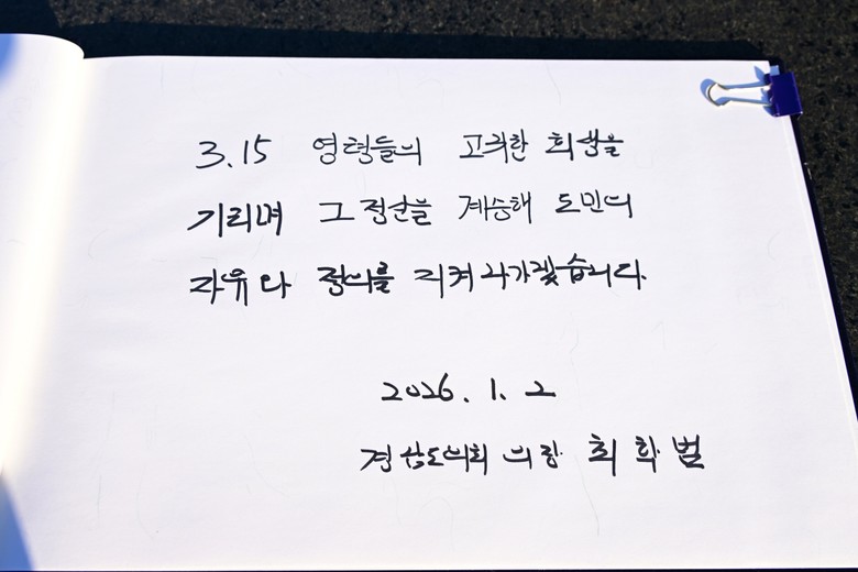 첫 번째 일정으로, 국립 3·15민주묘지를 찾아 헌화와 분향을 통해 지역의 역사 속에서 자유와 정의를 위해 희생한 영령들의 뜻을 기렸다. 이어 창원 충혼탑을 참배하며 국가와 공동체를 위해 헌신한 호국영령들의 숭고한 정신을 되새겼다.