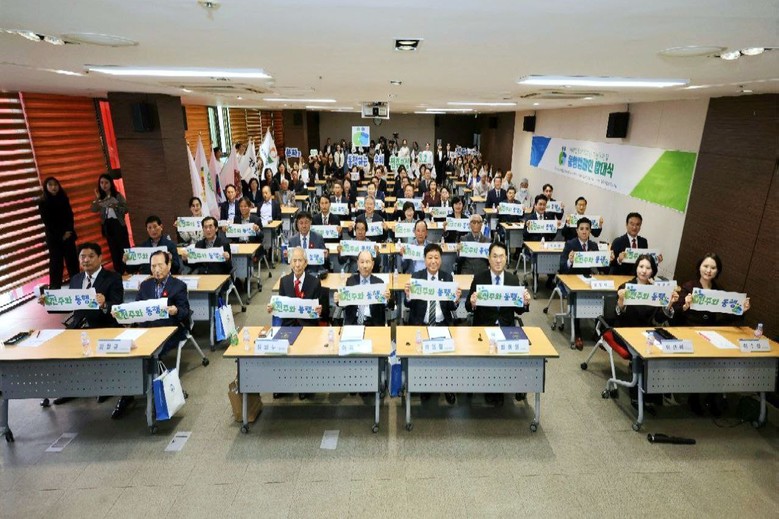 21일 한국 전통문화전당에서 HWPL 글로벌12지부 ‘동행 캠페인’ 발대식이 진행된 가운데 참석자들이 단체사진을 촬영하고 있다.