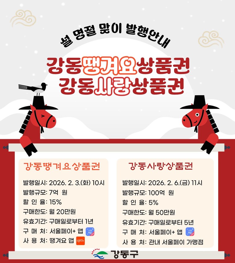 강동구 내 서울페이 가맹점에서 쓸 수 있는 강동사랑상품권은 100억 원 규모(할인율 5%)로 발행되며, 2월 6일 오전 11시부터 구매가 가능하다.