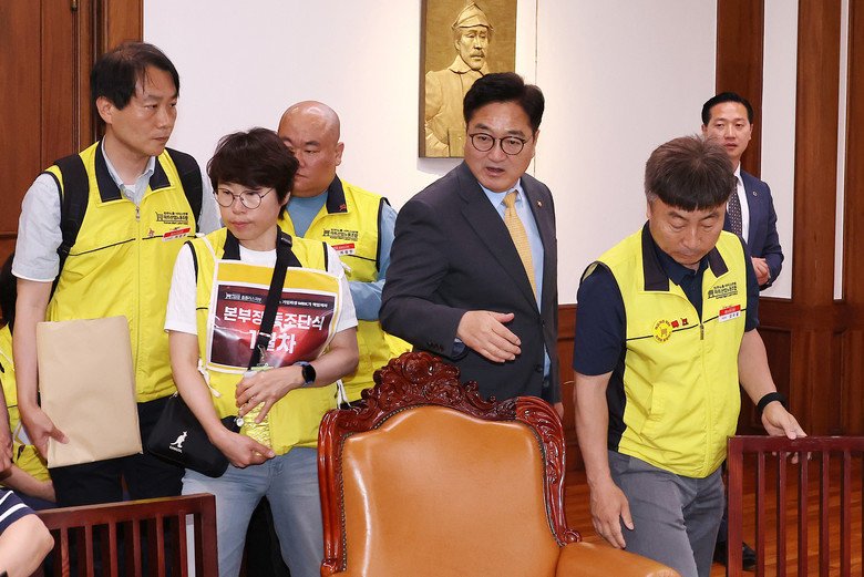 우원식 국회의장(왼쪽 네번째)이 22일 국회에서 MBK사태와 관련한 홈플러스노조원들을 만나 자리를 안내하고 있다. 2025.5.22