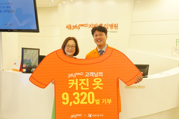 | ▲지난 30일 365mc병원 안재현 대표병원장(오른쪽)이 아름다운가게 이승선 국장에게 커진옷 기부 캠페인으로 모인 기부옷 9320벌을 기부했다. 사진제공=365mc |