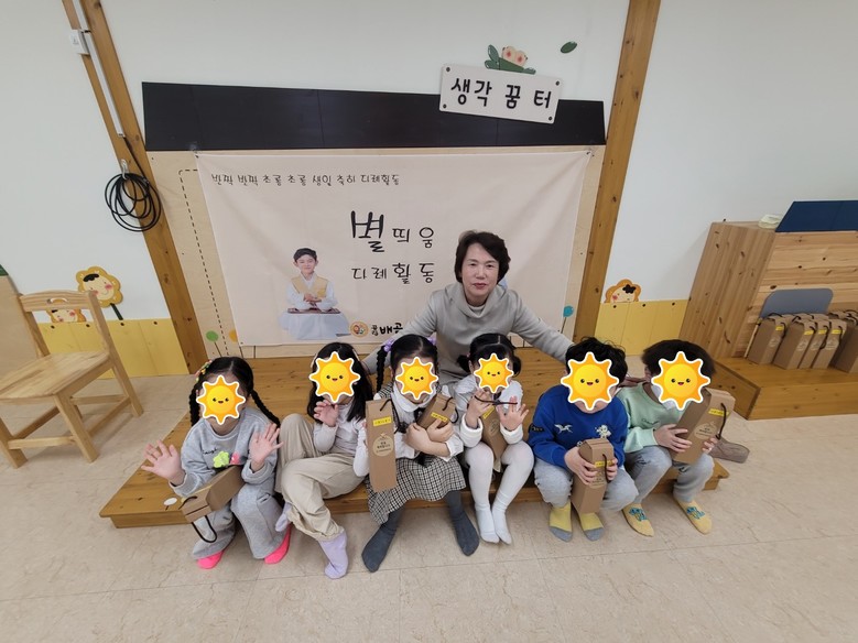 ◦ 매월 1일, 원장선생님과 꿈나래방에 모여 당월 생일유아 축하 활동 진행