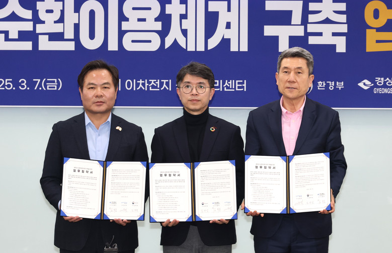 이날 협약은 증가하는 사용후 배터리의 재활용을 통해 친환경 산업 생태계를 조성하고 지속 가능한 미래를 준비하기 위해 마련된 자리로 김완섭 환경부장관, 김학홍 경상북도 행정부지사, 이강덕 포항시장이 참석했다.