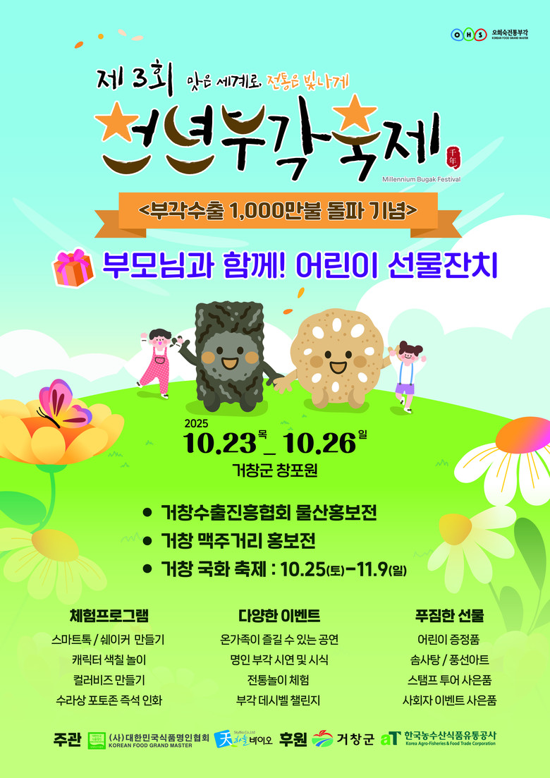 한국 전통 스낵 ‘부각’을 주제로 전시·체험·공연이 어우러진 산업·문화 융합형 축제로, 남녀노소 누구나 무료로 즐길 수 있다. 이번에는 사단법인 대한민국식품명인협회와 ㈜하늘바이오농업회사법인이 공동 주관하고, 거창군과 한국농수산식품유통공사(aT)가 후원한다.