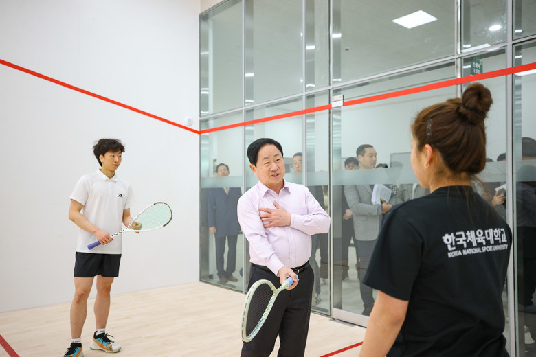 기념행사 후 주 시장은 지하 1층 수영장을 시작으로 시설 라운딩이 진행했다. 특히 관내 공공 체육시설 최초로 도입된 스쿼시장을 기념하는 시타를 하며 시설 상태를 직접 확인했다.