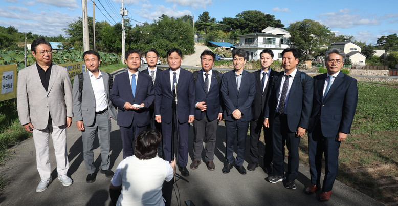 김영진 더불어민주당 前(전) 정권정치탄압대책위원장이 23일 경남 양산시 하북면 평산마을 문재인 전 대통령 사저 인근에서 문 전 대통령 면담 결과를 브리핑하고 있다. 2024.9.23