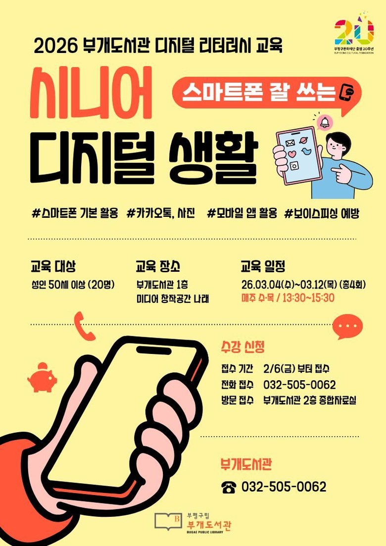 모집 인원은 선착순 20명이며, 접수는 6일부터 시작된다. 참여를 희망하는 주민은 부개도서관을 방문하거나 전화(☎505-0062)로 신청하면 된다.