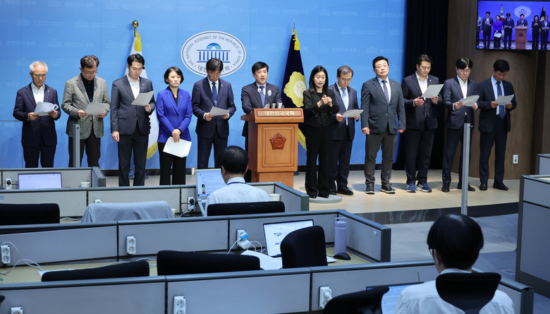 더불어민주당 검찰독재대책위원회 소속 의원들이 16일 오후 서울 여의도 국회 소통관에서 기자회견을 열고, 김건희 여사의 도이치모터스 주가조작 연루 사건에 대한 수사를 최종적으로 점검하기 위한 검찰의 '내부 레드팀' 회의에 대해 "면죄부 수순 밟기"라며 규탄하고 있다. 2024.10.16