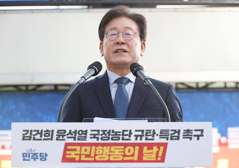 더불어민주당 이재명 대표가 2일 서울 중구 서울역 일대에서 더불어민주당 주최로 열린 김건희 윤석열 국정농단 규탄·특검 촉구 국민행동의날에서 발언하고 있다. 2024.11.2