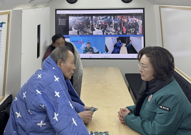 | ▲ 박희영 용산구청장이 재난현장지휘버스에서 임시대피 중인 청파동 화재 피해 주민들의 안전 상태를 살피고 있다. |