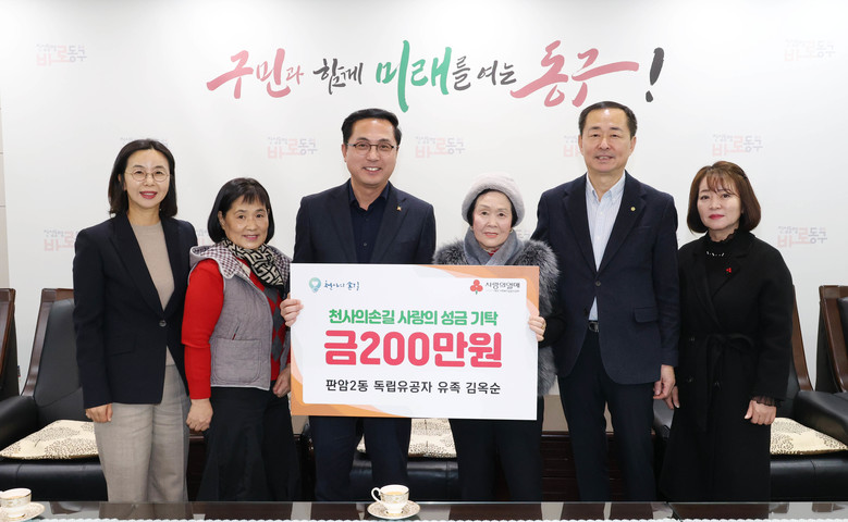 박희조 동구청장은 “독립유공자의 숭고한 정신을 이어받아 지역사회를 위해 따뜻한 나눔을 실천해 주신 김옥순 님께 깊이 감사드린다”며 “기탁된 성금은 도움이 필요한 이웃들에게 소중히 전달하겠다”고 전했다.