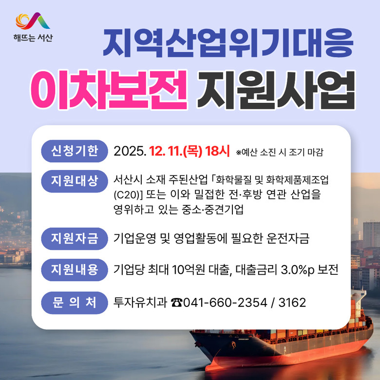 이수영 서산시 투자유치과장은 “이번 이차보전 지원사업이 지역 석유화학 기업들의 경영 부담을 완화하고 지역경제 활성화에 기여할 것으로 기대한다”라며 “앞으로도 다양한 기업 지원책을 발굴해 지역 산업의 경쟁력 강화와 경제 다변화를 위해 최선을 다하겠다”라고 말했다.